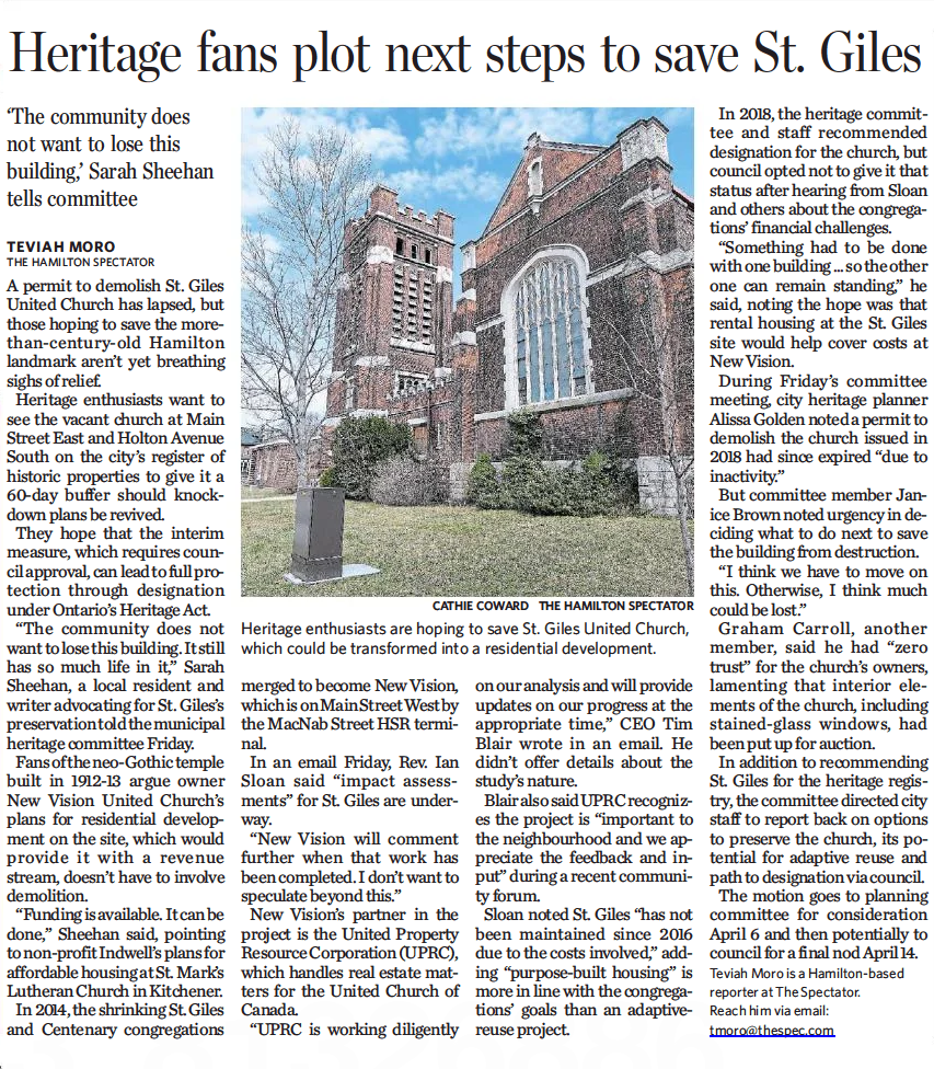 Thanks to Teviah Moro for his story about residents’ efforts to save the former St. Giles United Church from demolition. Members of the Friends of St. Giles delegated to the Hamilton Municipal Heritage Committee on March 26th, 2021.