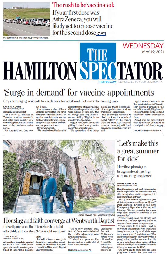 Front page of today’s Hamilton Spectator: Wentworth Baptist is teaming up with Indwell to save its century-old church and build 40 affordable-housing units.