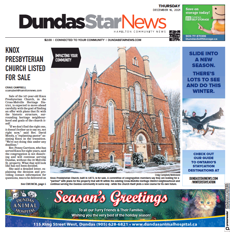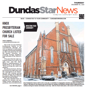Dundas Star News print edition: “Knox Presbyterian Church listed for sale” (December 16, 2021, 3, 5) | online: “Dundas Knox Presbyterian Church listed for sale” (December 9, 2021)