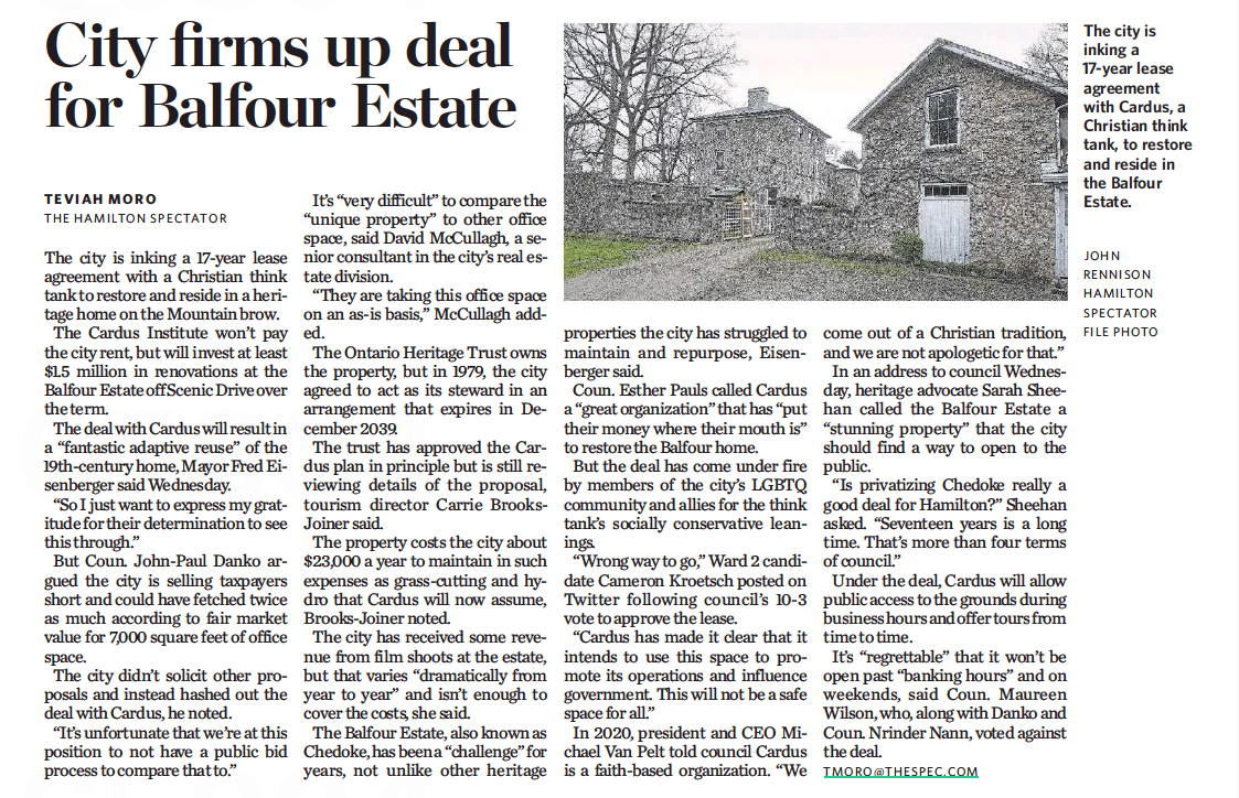 Teviah Moro wrote about it in the long weekend edition of the Hamilton Spectator. Spec print edition: Teviah Moro, “City firms up deal for Balfour Estate,” Saturday, May 21, 2022, A6 | online: “Hamilton council firms up $1.5M deal with Cardus for Balfour Estate. Danko argues unique office space could have fetched twice as much“